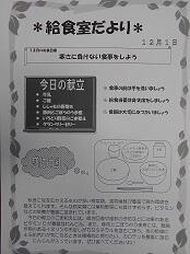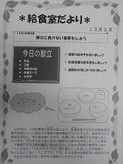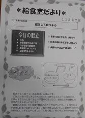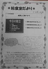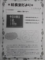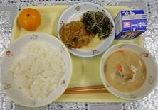 昨日の給食は、ご飯・豆腐ハンバーグきのこソース・かす汁・磯香和え・果物(みかん)でした。かす汁に入っていた鮭は、身がプリプリしていて、汁とうまく絡みおいしい一品でした。ハンバーグも生姜の少しきいたソースが食を進めました。