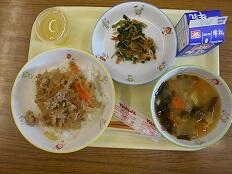 本日の給食は、豚丼・みそ汁・おかか和え・パインゼリーでした。豚丼のお肉が柔らかく、玉ねぎの甘さがしらたきに染み込み絶品でした。今日の和え物は、生徒向けに少し甘い味付けで、食べやすかったです。パインゼリーの爽やかな甘さも印象的でした。