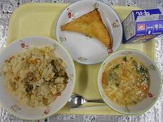 本日の給食は、チンゲン菜チャーハン・中華風卵スープ・アップルパイでした。チャーハンは口にした時のほんのりとしたにんにくの香りと味が食欲をそそります。スープとの相性も抜群です。アップルパイは、給食室の方々が一つ一つ作ってくれました。サクッとした触感のパイ生地とリンゴの甘さが最高でした。