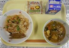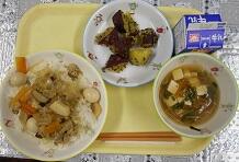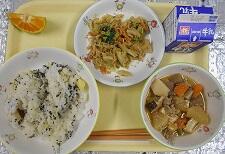 本日の給食は、千葉県産のさつま芋の入ったさつま芋ご飯、大根と豚肉の煮物、彩り野菜のごま和え、果物(はやか)でした。さつま芋ご飯は、さつま芋の甘みとごまの風味が合わさり、ご飯が進む献立です。ごま和えは、色とりどりの野菜が入っていて、少し甘い味付けは、生徒向けに調理されていました。煮物も一つ一つの具材に味がしみ込んでいて、とてもおいしかったです。今日は寒い一日でした。今週も元気に学校生活を送ってほしいと思います。