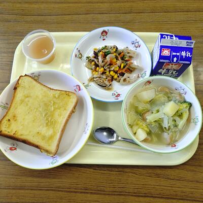 本日の給食はさつまいもトーストです。千葉県産のさつまいもをペースト状にしてトーストに塗りました。甘すぎず、ポトフやサラダとの相性抜群でした。美味しく頂きました。
