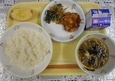 本日の給食は、ご飯・ヤンニョムチキン・小松菜とにんじんのナムル・わかめスープ・果物(りんご)でした。今日は3年生のリクエスト給食、チキンは食べやすくご飯と合うので人気なのがわかります。わかめスープもマロニーが入っていて優しい味付けで食べやすくなっていました。
