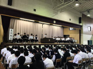 コロナ禍での開催なので、多目的室をメイン会場として各クラスの班長が集まり、その他の生徒は各教室の大型モニターで視聴する形となりました。