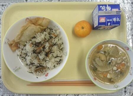 本日の給食は、ご飯・鮭の西京焼き・けんちん汁・かぼちゃのそぼろあんかけ・果物(りんご)でした。本日は「冬至献立」です。かぼちゃのそぼろあんかけは、柔らかいかぼちゃの上に少し甘いあんかけがかかっており、ご飯がどんどん食べれます。けんちん汁も優しい味で、心も体も温まりました。いよいよ給食も明日で終わりです。