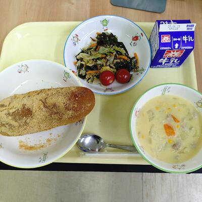 本日の給食は、肉味噌ひじき丼・みぞれ汁・スイートポテトでした。肉味噌ひじき丼は、多くの食材が味噌と合い、白米がすすむ献立です。みぞれ汁は、大根おろしが多く入っていて体が温まります。スイートポテトは給食室の手作りで、甘さ控えめで丁度よく仕上がっていました。