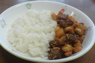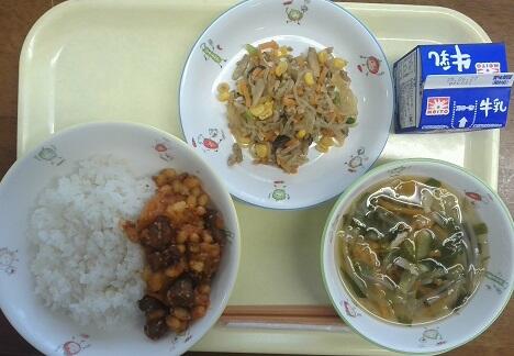 本日の給食は、ご飯・レバーとポテトのケチャップ和え・くまのおうちのスープ・しらたきソテー・果物(夢オレンジ)でした。ケチャップ和えは、レバーとポテトが食べやすい1口大になっており、ケチャップとのバランスも良くご飯との相性のいい献立です。スープはあっさりした味で野菜も豊富です。