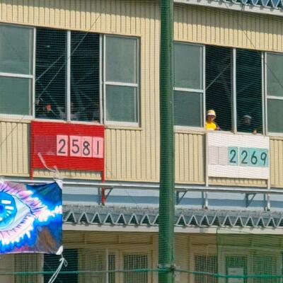 いわゆる「台風の目」…学級カラーの巨大な棒を、4人1組で運びます。