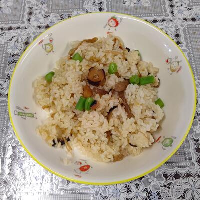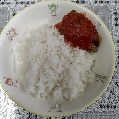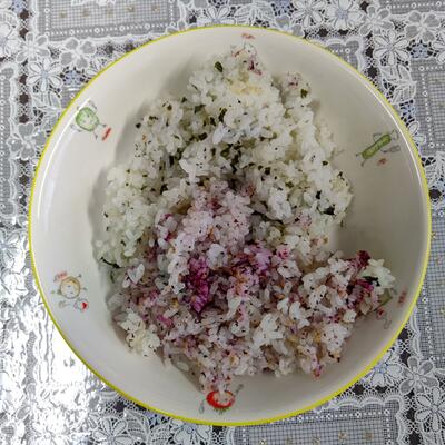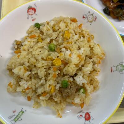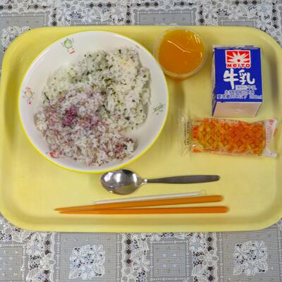 体育祭が昨日、無事実施できたので食器に盛りつけて、2色ご飯として提供されています。