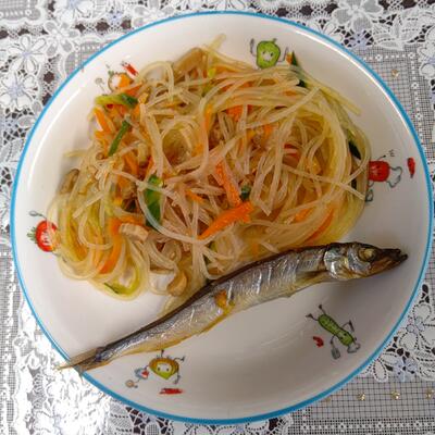 焼きししゃもの旨みと苦みがアクセントになり、バンサンスーは爽やかで、よく調和した献立です。