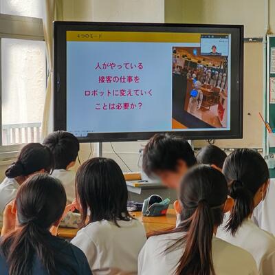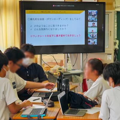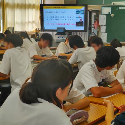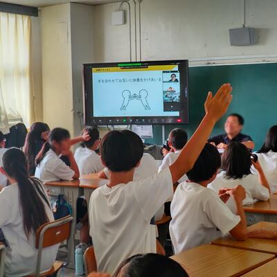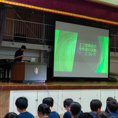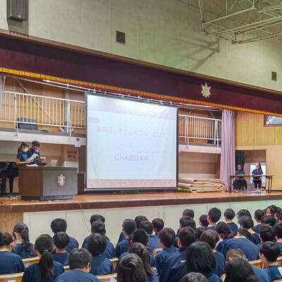 途中、クイズやペアワークなど生徒の活動の場面も加えながら、温暖化の話、コミュニケーションのコツ、失敗を成功に変えるスーパーポジティブ思考の身に付け方など、有意義な話が盛りだくさん。