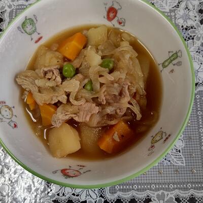 お肉たっぷり。ニンジン、じゃがいもはホクホク、タマネギはトロトロ。
