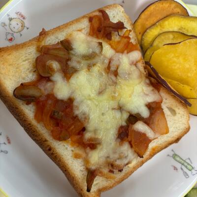 厚切りの食パンのカリカリトーストに、ピザペーストの旨みとトロトロチーズが絶品のピザトースト。