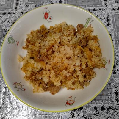 辛さは控えめながら、本格的な味わいの白菜キムチと大きめの豚肉がたっぷり入ったキムチご飯。