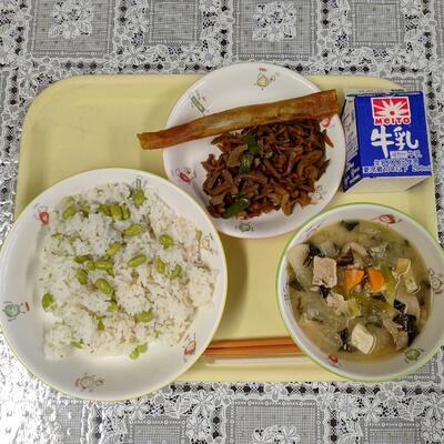 白百合学級のみんながさや剥きをした、グリーンピースの炊き込みご飯です✨