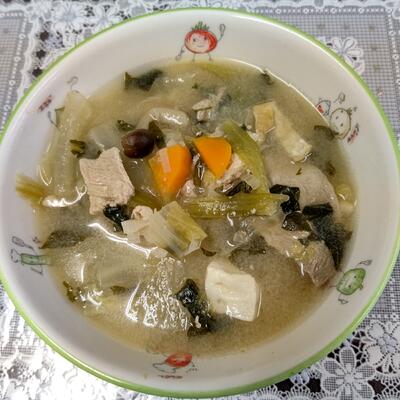肉や季節の野菜がふんだんに入っていて、味噌汁仕立てのなかに、にんにくの香りが食欲をそそる「僧兵汁」。