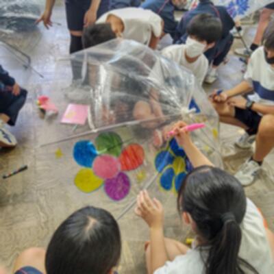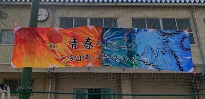 美術部のみんなが、体育祭の象徴としてグラウンドに掲げられる「横断幕」を作成中!
