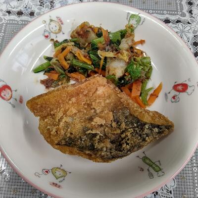 柔らかい鯵の身、パリパリの衣に、タマネギやピーマンに染み込んだ甘酢の程よい酸味がよく合います。