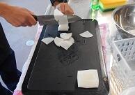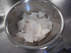 本日から2年生が1回目の調理実習です。今日は1組と4組が行いました。来週までにすべての学級が行います。「大根のすまし汁」を作ります。朝、早めに登校し、鍋に水と昆布を入れて授業が始まるまで置いておきます。授業が始まると同時に調理がスタート、大根の皮を剥き、いちょう切りにして置いておきます。