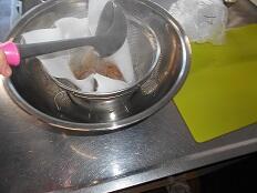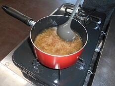 続いて鍋から昆布を取り出し、鰹節を入れて出汁を取った後冷まします。冷ました後、鰹節が沈んだらざるにキッチンペーパーをしいてこします。