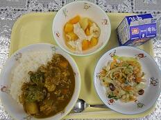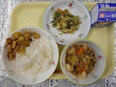 本日は、ご飯・花野菜カレー・ビーンズサラダ・フルーツ杏仁豆腐でした。カレーに入っているカリフラワーとブロッコリーは、熱することで食感も変わり、味わいもまた違ってきます。ビーンズサラダも色とりどりで多くの野菜が入っています。しっかり食べてインフルエンザや風邪を予防してほしいと思います。