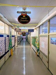 白百合学級の教室前の廊下と天井に、クリスマスグッズが飾り付けられました。調理室や図書室に行く生徒も多いので、クリスマス気分を味わえます。