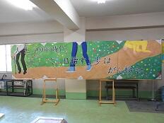校長室前の昇降口には「人生100年時代 目指すはがん検診」と書いた看板も置かれています。