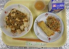 本日の給食は、麻婆豆腐丼・ひじきの春巻き・もやしのナムル・もものゼリーでした。麻婆豆腐丼は豊富な具材が細かく切ってあり食べやすく、味噌との相性も抜群で、ご飯が進む献立です。ひじきの春巻きはサクッとした食感が食べやすいようで、生徒もしっかり食べていました。もものゼリーは、甘すぎず程よい甘さで食べやすかったです。