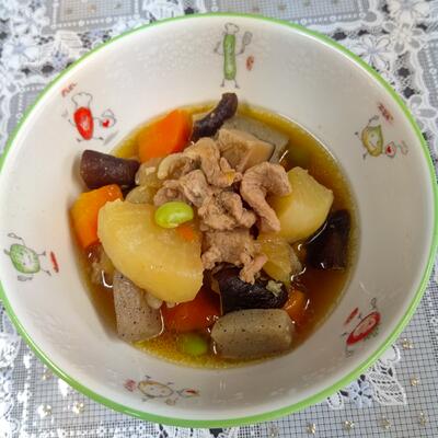 柔らかくて甘みがあり、みずみずしい旬の大根…出汁の味わいが染みて絶品です。豚肉や椎茸の旨味が広がり、ニンジンと枝豆の彩りも鮮やかです。