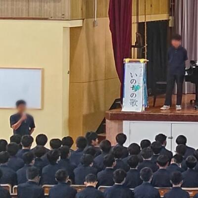 次は1年生の番。学年合唱は「校歌」です。きれいに歌えていて、声量も2年生に引けをとりません。二中の校歌の美しさを改めて感じさせてくれました。
