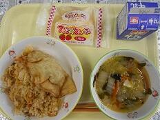 本日は定例研のため、午前中授業、給食を食べて下校でした。給食も配膳のしやすい献立で、キムチご飯・揚げ餃子・わかめスープ・いちごクレープでした。キムチご飯は、白菜キムチの味がしっかり残り食べやすく、あっさりとした味のわかめスープと合わせると、いくらでも食べれそうです。揚げ餃子は、サクッとした衣の中に大きな餡が入っていて、ボリュウム満点です。クレープは生徒たちが喜ぶデザートです。