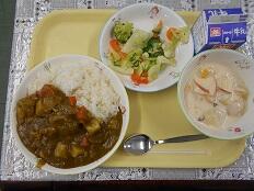 本日の給食は、ポークカレーライス・花野菜のサラダ・ヨーグルトあえでした。給食のカレーは、「給食でしか出せない味わいのカレー」と言われています。今日のカレーも肉と野菜がたっぷりでおいしくいただきました。ヨーグルト和えは、バナナやリンゴなどの果物の甘さが、ヨーグルトの酸味とうまく混ざり、口当たりの良い甘さでした。
