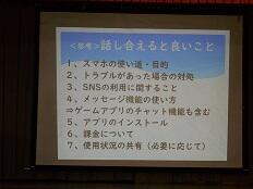 平日のため、保護者の方は少数の参加でしたが、保護者の方に対しても話をしていただきました。保護者の方には「お子様のスマートフォンや携帯電話の使用の現状を把握し、対応策や予防策を積極的に一緒に考えていき、モラルやマナーを育てていくことが必要」という話がありました。お忙しい中お越しいただいた保護者の皆様、ありがとうございました。