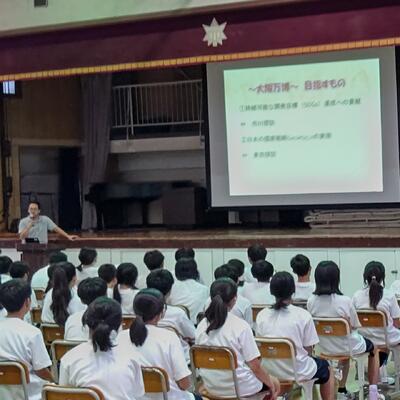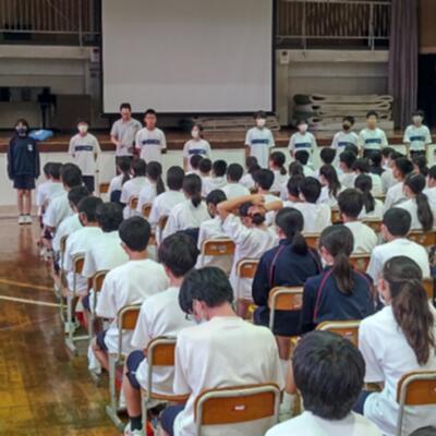 1年生にとって、初めての中学校での校外学習。みんな興味深そうに話を聴いていました。
