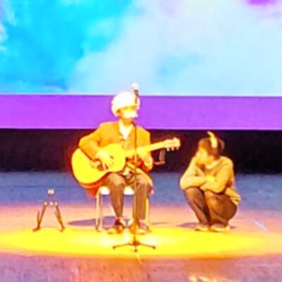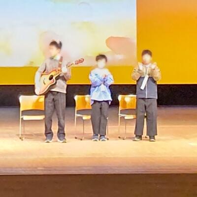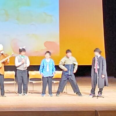 二中・白百合学級の出番は午前の五番目。小学生のかわいい創作劇や桃太郎の英語劇、小中合同の市川市90周年を題材にした発表など素晴らしい発表が続いた後、幕前に二人の二中生が出てきて挨拶をし、いよいよ「劇 イヌと友だちのギター」のスタートです。