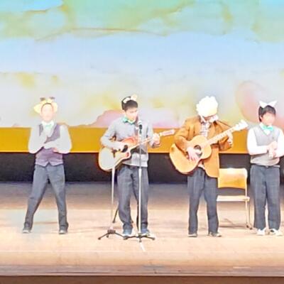 ギタリストのおじいさんとギターの弟子の犬の心暖まる物語。熊のピアニストをはじめ、たくさんの動物の音楽家も登場し、最後には実際にみんなでの演奏もある、とても楽しい舞台でした。白百合のみんなの熱演に全校生徒は大喜びでした。