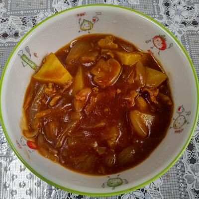 お肉たっぷり。じゃがいも、ニンジン、タマネギ…それぞれの野菜の味がしっかり感じられながら、ソースとも一体になって、白いご飯によく合います。