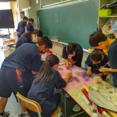 「学級旗」制作の仕上げをみんなで協力して行っています。