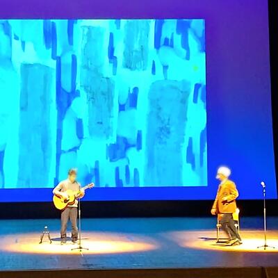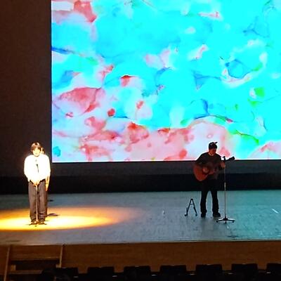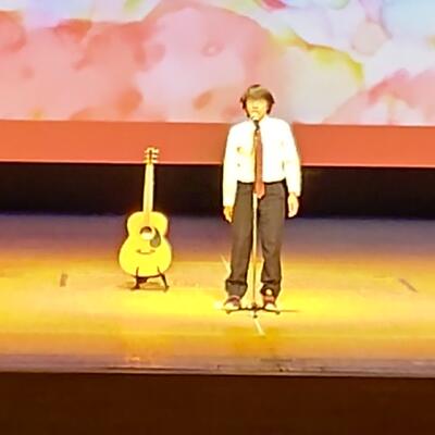 二中・白百合学級の出番は午前の五番目。小学生のかわいい創作劇や桃太郎の英語劇、小中合同の市川市90周年を題材にした発表など素晴らしい発表が続いた後、幕前に二人の二中生が出てきて挨拶をし、いよいよ「劇 イヌと友だちのギター」のスタートです。