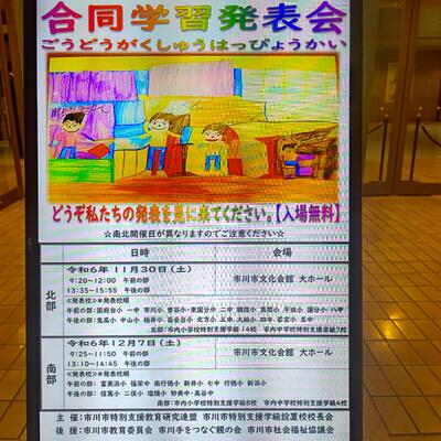 11月30日(土)、市川市小中学校特別支援学級合同学習発表会(北部地区)が開催され、市川市文化会館を会場に市川市北部の学校(小学校14校、中学校7校)が集まって、それぞれ工夫を凝らした発表を行いました。