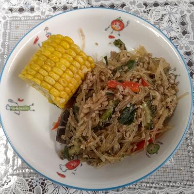 ピーマン、パプリカ、茄子、ゴーヤなど、たくさんの種類の夏野菜が入った麻婆春雨。挽肉とそれぞれの野菜の風味がよくあって、ご飯が進みます。