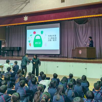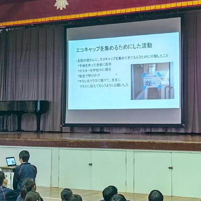 はじめは白百合学級が務めるエコ委員会の発表です。これまでやってきたエコ活動…なかでもペットボトルのキャップを集めてワクチンにかえる、エコキャップ運動について、スクリーンも使って分かりやすく報告します。活動の流れや成果、そして協力へのお礼を堂々と発表できました。