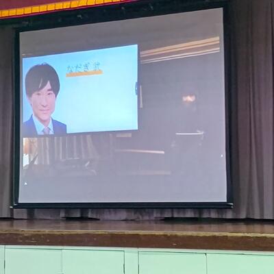 要点や画像をスライドに写しながら、いじめや不登校を経験しながらも様々な出会いや決断があって自分の思う道を歩んできたなだぎ武さんの半生と思いを、一生懸命伝えてくれました。