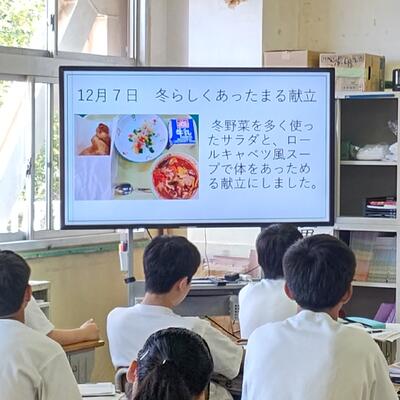 今日は家庭科の先生と一緒に、「食育」の一環として、給食の献立を考える授業。