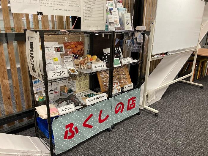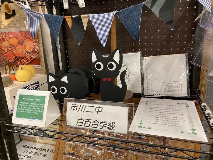 6月から市川市役所第1庁舎2階「ものづくり工房」の室内に、福祉の店コーナーが設置されました。そこに、現在、白百合学級の作業製品が展示されています。