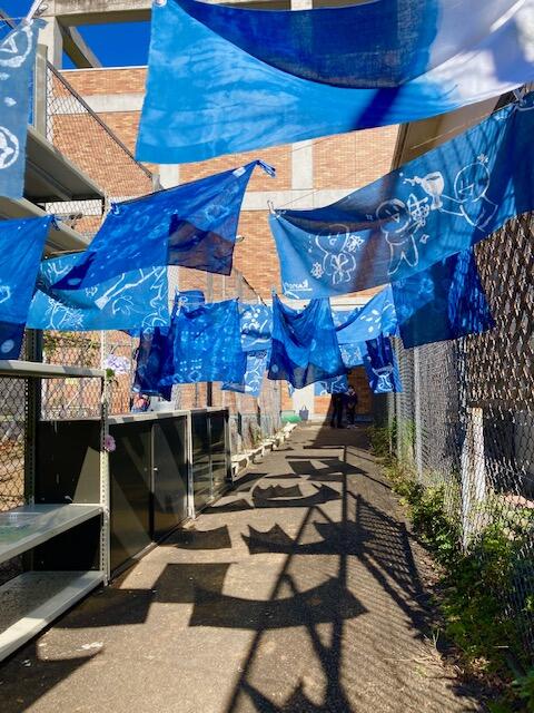 また、部活動で制作した藍染の作品を商大敷地内にある畑に展示しました。