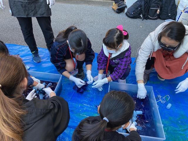 コロナ禍ということもあり、参加者数を限定しての開催となりましたが、小さなお子さんから大人までご家族みんなで藍染を楽しんでいました。美術部の皆さんお手伝いありがとうございました。