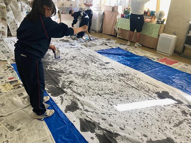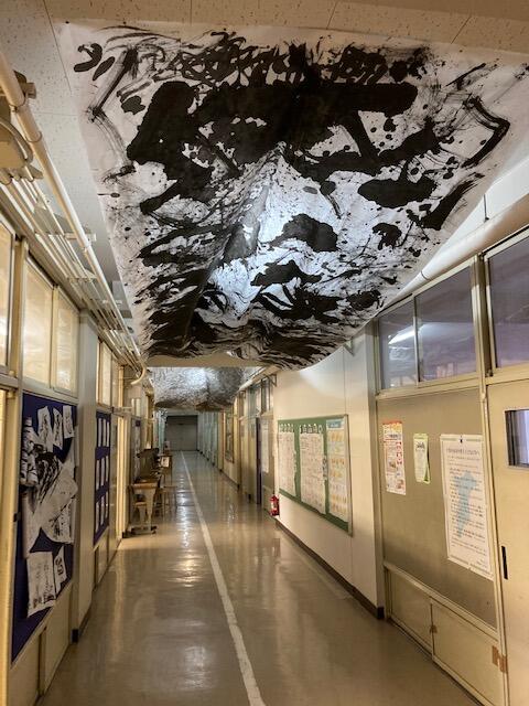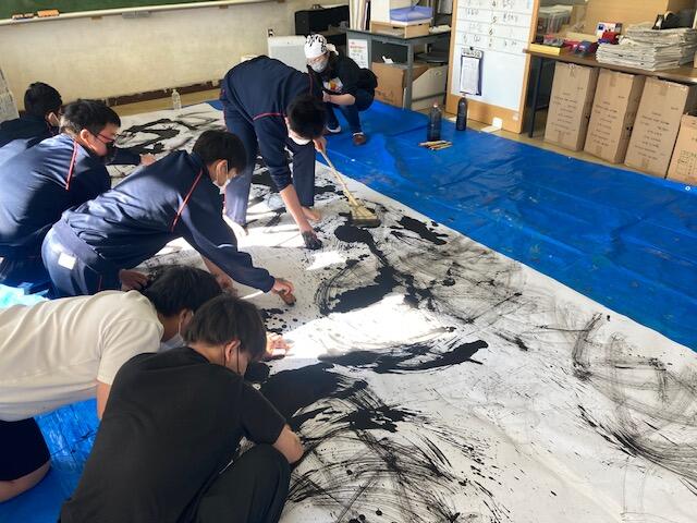 水墨画を終え、生徒からは「こんな大きな紙には描いたことがなく楽しかった」「ほうきで描いたのは初めてで楽しかった」など、満足した様子がうかがえる感想が多くありました。