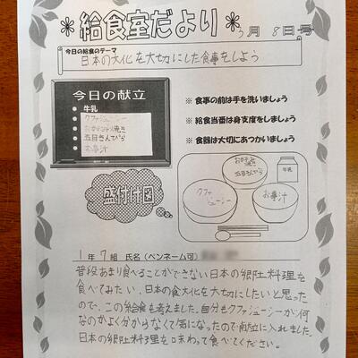 今日も1年生が考えた給食。日本の食文化を考えようというテーマです。