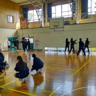 体育館を半分に分けて、創作ダンスと剣道の実践…選択制です。