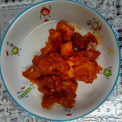 竜田揚げの衣の食感と少し酸味の効いた甘辛い味つけがよく合います。